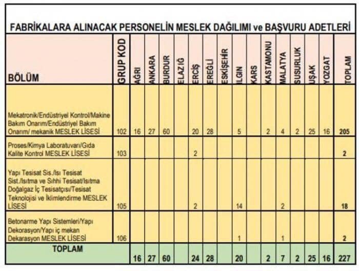 4- Fabrikalarımıza alınacak personelin niteliklerini ve sayılarını gösteren tablo aşağıdadır.