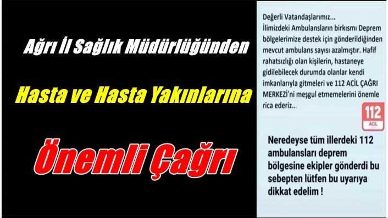 Ağrı İl Sağlık Müdürlüğü tarafından ‘’Ülkemizde yaşanan deprem felaketi sonrası bölgede yapılan çalışmalara destek verilmek üzere ilimizde hizmet gösteren Ambulans ve Evde Bakım araçlarının bir kısmı deprem bölgelerine gönderildiğinden mevcut ambulans ve personel sayımız azalmıştır.