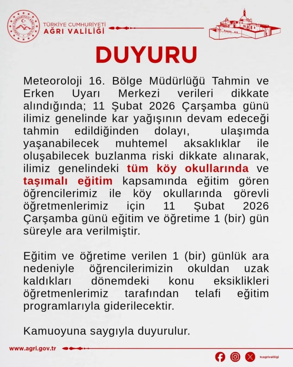 Meteoroloji 16. Bölge Müdürlüğü Tahmin ve Erken Uyarı Merkezi’nden gelen üst üste uyarıların ardından, Ağrı Valiliği beklenen kararı açıkladı. 11 Şubat Çarşamba günü il genelinde etkisini sürdürmesi beklenen yoğun kar yağışı, ulaşımda yaşanabilecek aksaklıklar ve buzlanma riski nedeniyle eğitime ara verildi.