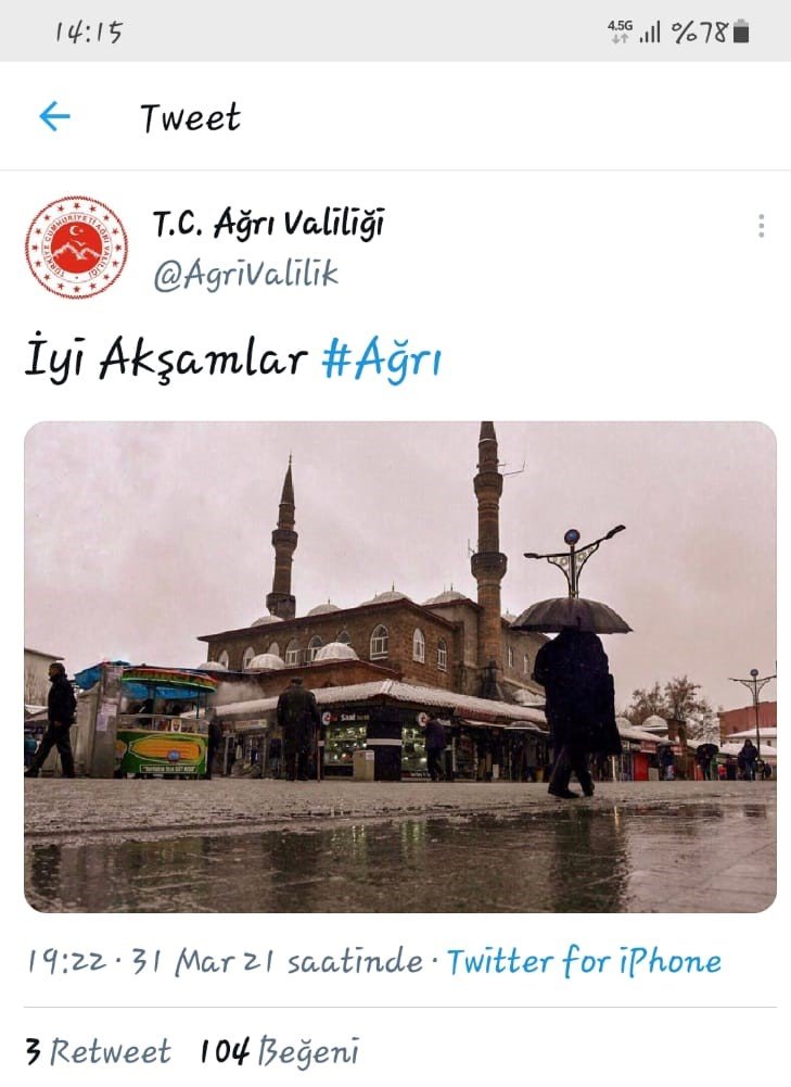 Ağrı Valiliği resmi twitter hesabından Ağrı Merkez Camii’nin görüntüsünü ‘’Hayırlı Akşamlar’’ ifadeleri ile paylaştı.