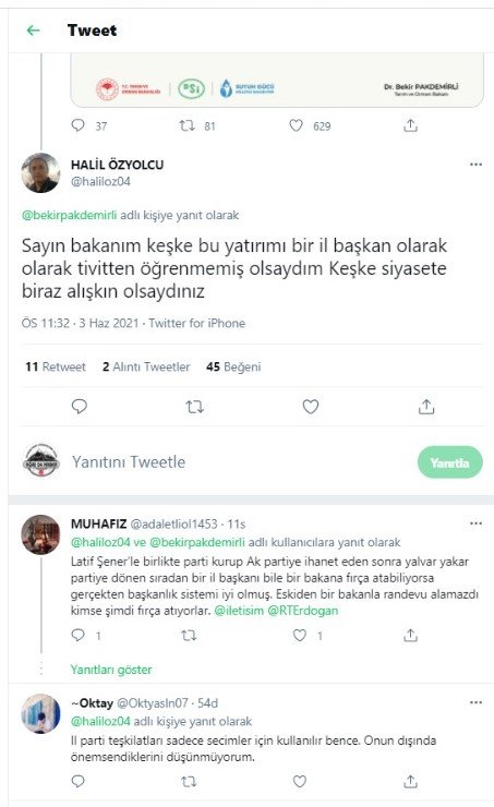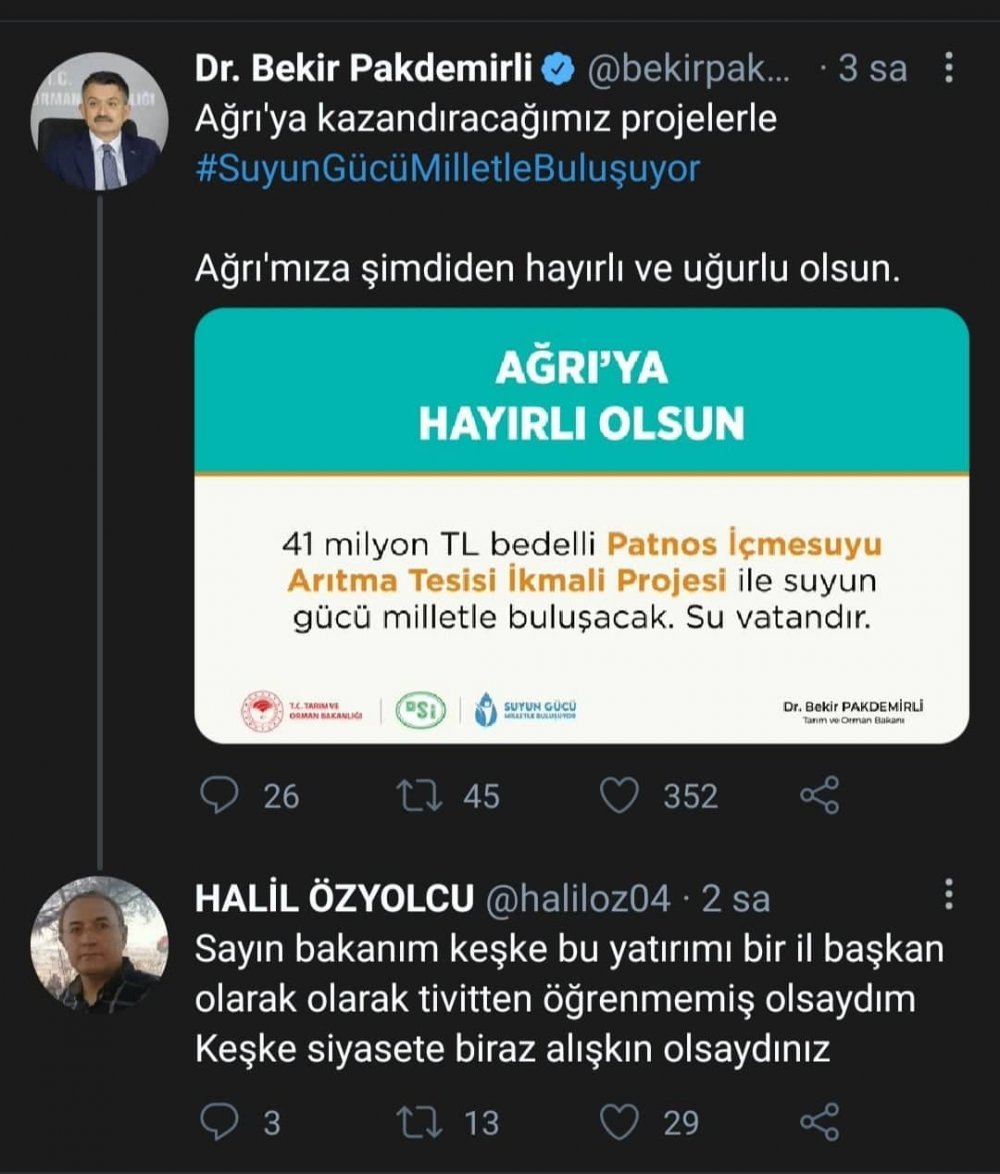 Pakdemirli'nin Patnos İçme Suyu Projesini Twitter sayfasından paylaşmasının ardından AKP Ağrı İl Başkanı Halil Özyolcu Bakan Pakdemirli'yi siyaset bilmemekle suçladı.