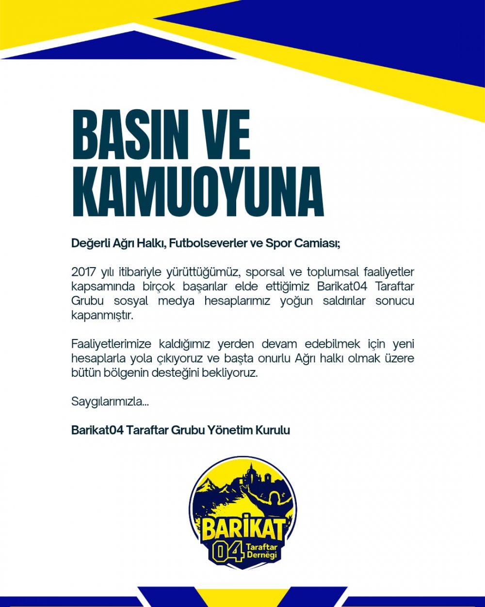 Konuyla ilgili Barikat04 Yönetim Kurulu tarafından yapılan açıklamada, sporsal ve toplumsal faaliyetlerin aksamaması adına yeni hesaplar üzerinden yola devam edileceği belirtildi. Açıklamada şu ifadelere yer verildi: