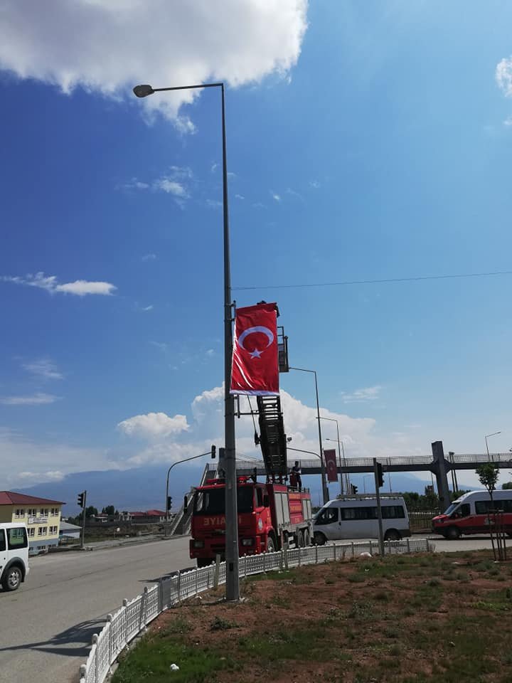 Ağrı’nın Doğubayazıt İlçesinde orta refüjlerde asılı olan Türk Bayrakları yenilendi.