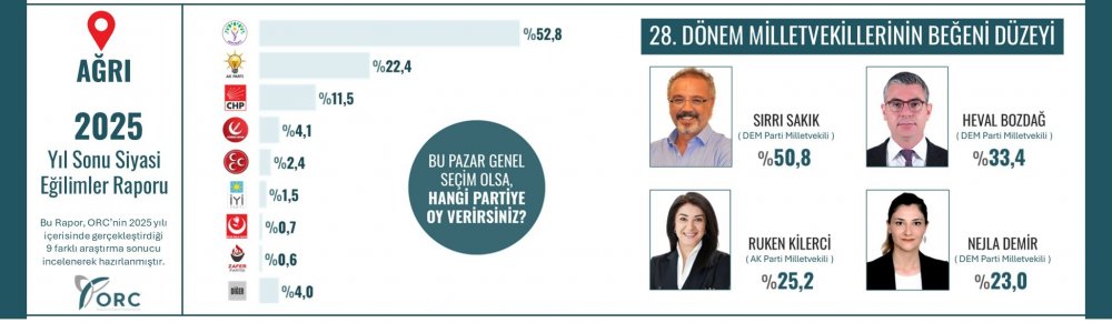 ORC Araştırma’nın Ağrı özelinde yaptığı araştırmada 2023 Milletvekilleri seçimlerinde yüzde 52,8 oy alan DEM Parti milletvekili Sırrı Sakık yüzde 50.8 oy ile Ağrı’nın en çok beğenilen Milletvekili oldu.