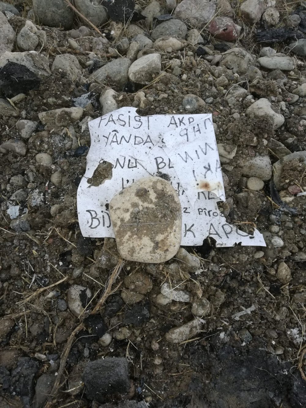 Araçların yakınında bulunan ve uçmaması için taşla sabitlenen pusulada PKK ve Apo isimlerinin yer aldığı görüldü.