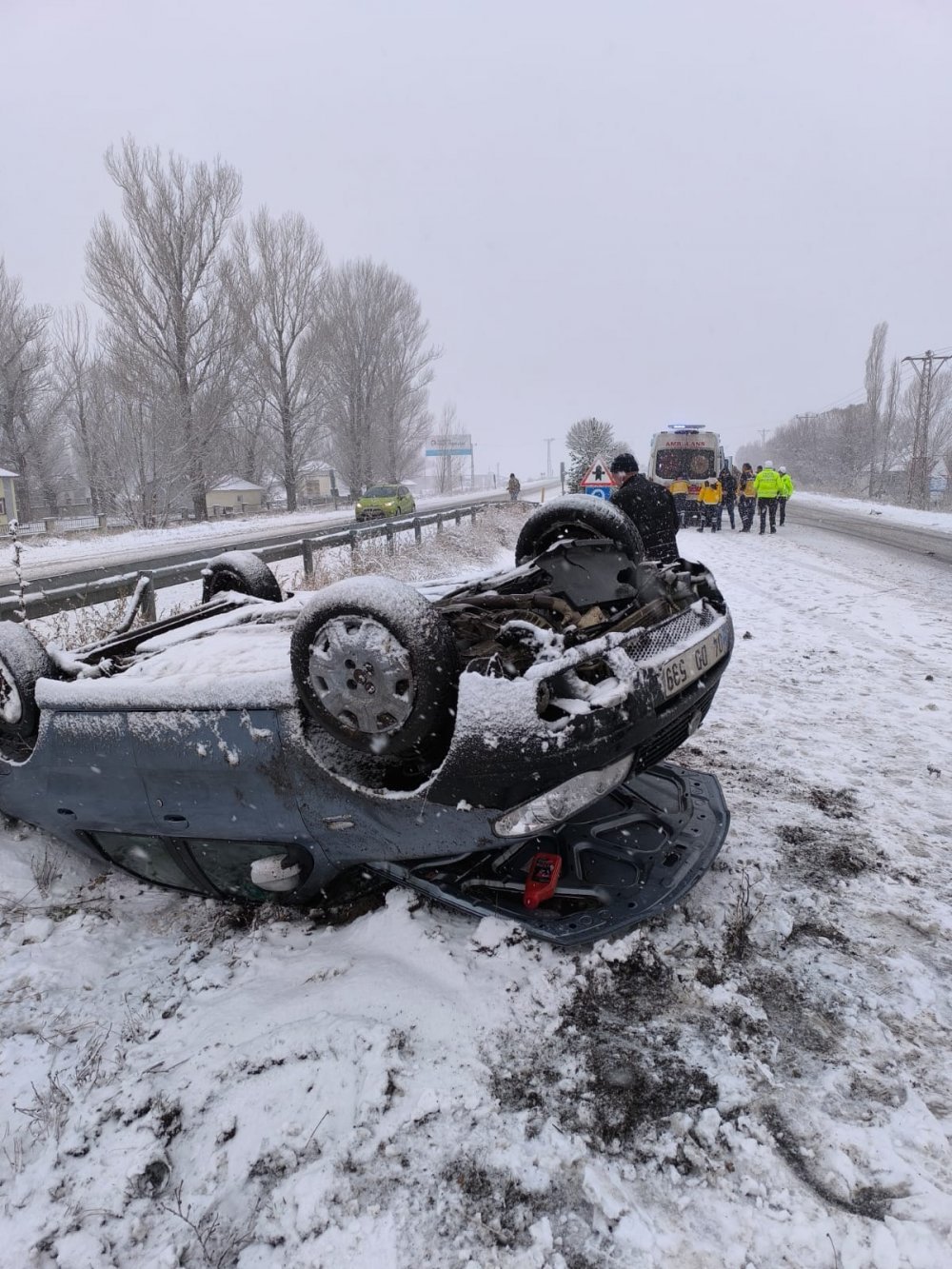 04 DD 539 Plakalı otomobil kar yağışı nedeni ile kayganlaşan yolda sürücünün direksiyon hakimiyetini kaybetmesi sonucu takla atarak yoldan çıktı.