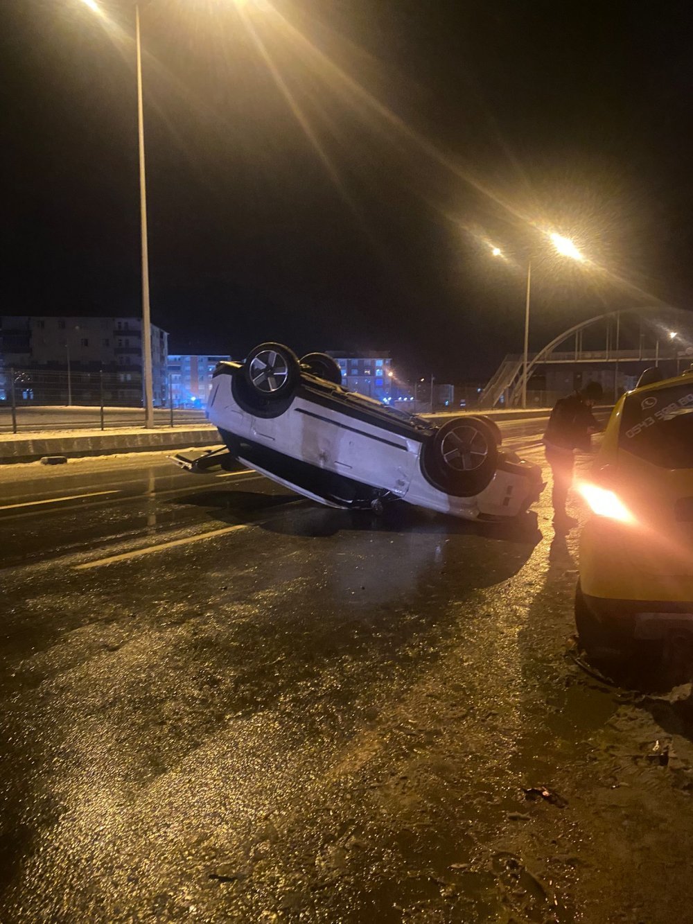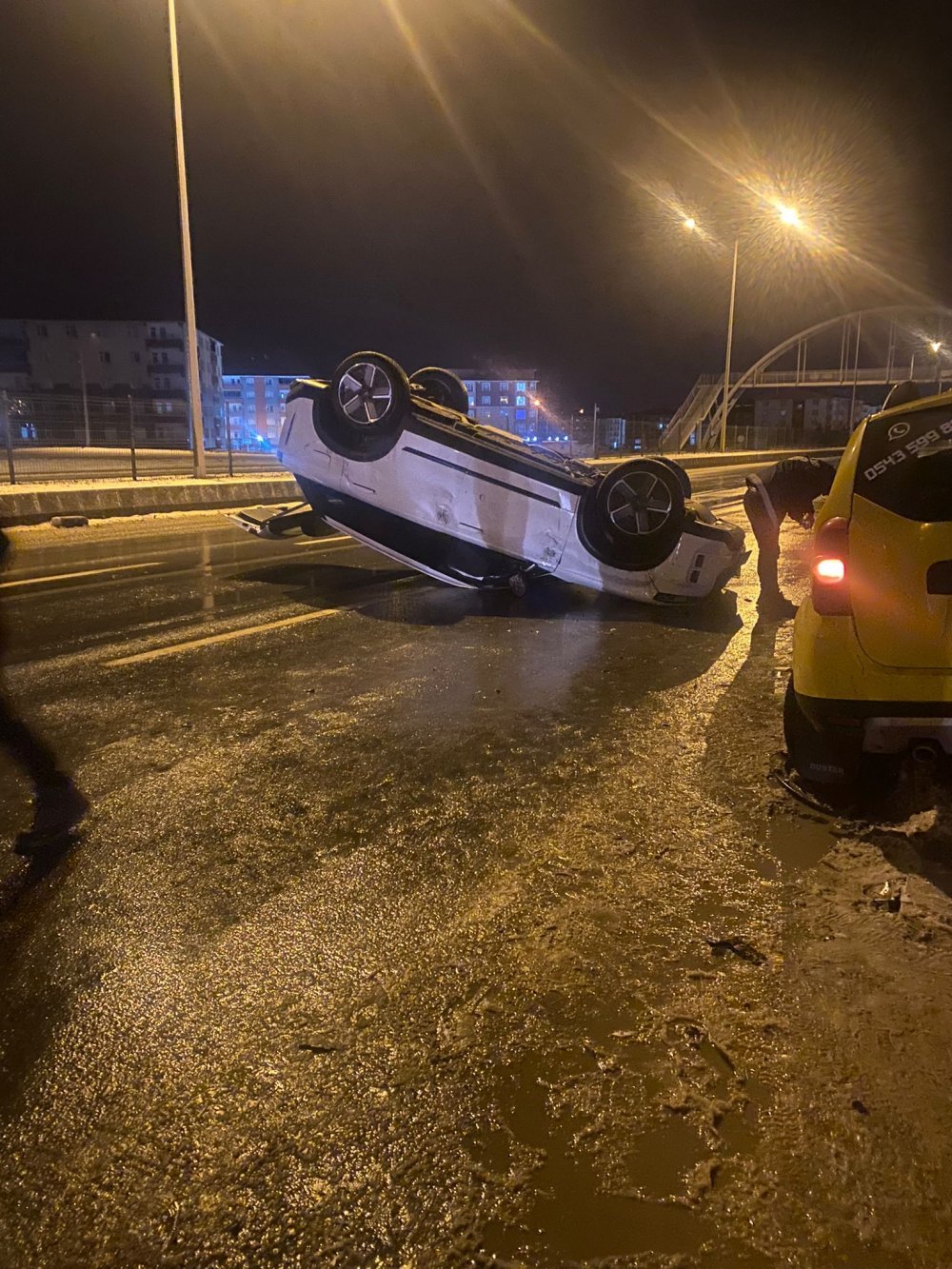 Plaka bilgileri ve sürücüsü öğrenilemeyen bir araç kayganlaşan zeminde önünde seyreden ticari taksiye çarptıktan sonra takla atarak durabildi.Sürücünün hafif sıyrıklarla atlattığı kazada maddi hasar oluştu.