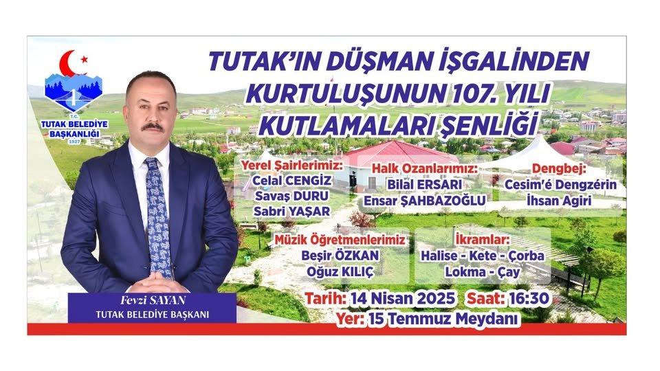 14 Nisan’da düşman işgalinden kurtuluşunun 107.yılını kutlayacak olan Tutak’ta ,Tutak Belediye Başkanı Fevzi Sayan sınırlı bütçeye rağmen kurtuluş ruhuna yaraşır bir programla organize edilmesi için tüm imkanlarını seferber etti.