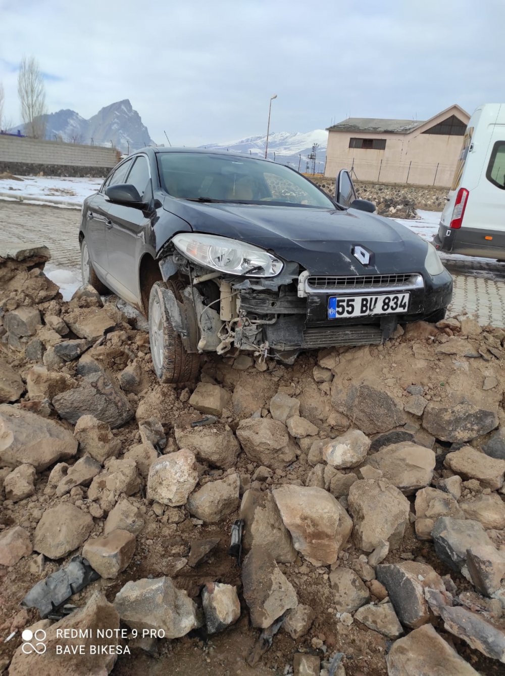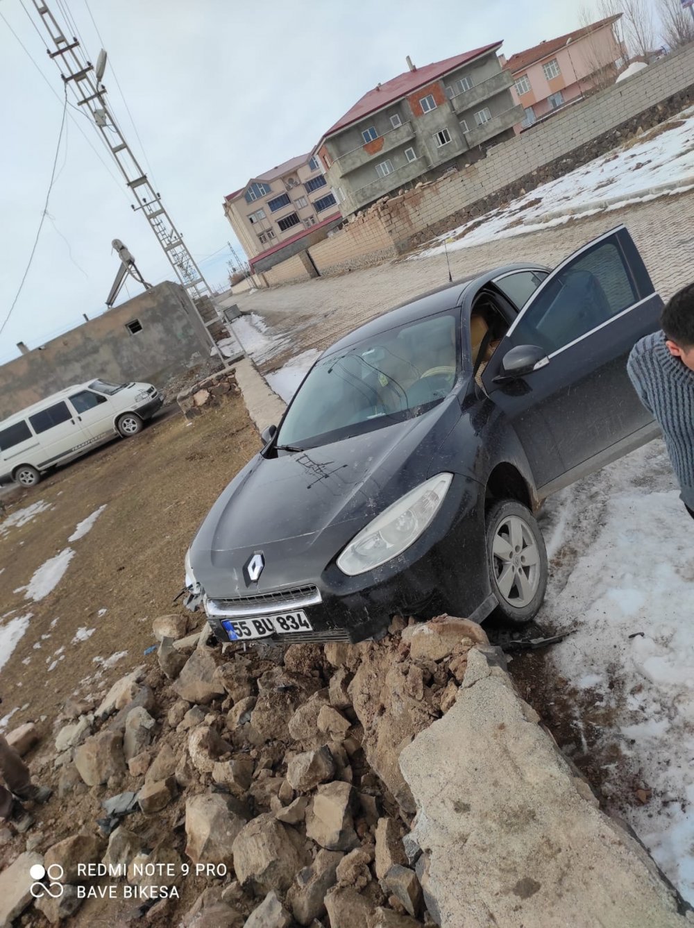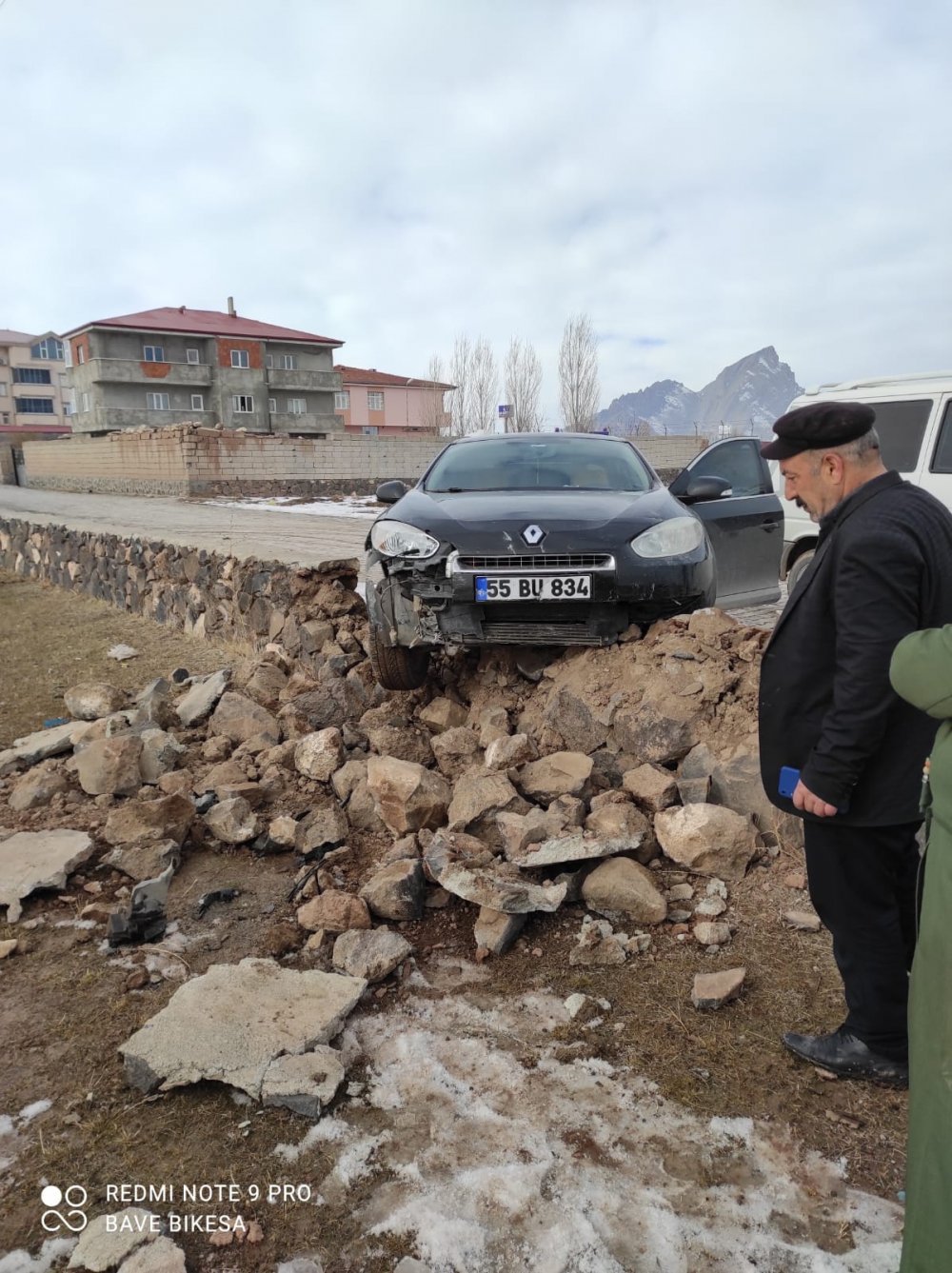 Taş duvara çarparak duran araç yıkılan duvarda asılı kaldı.