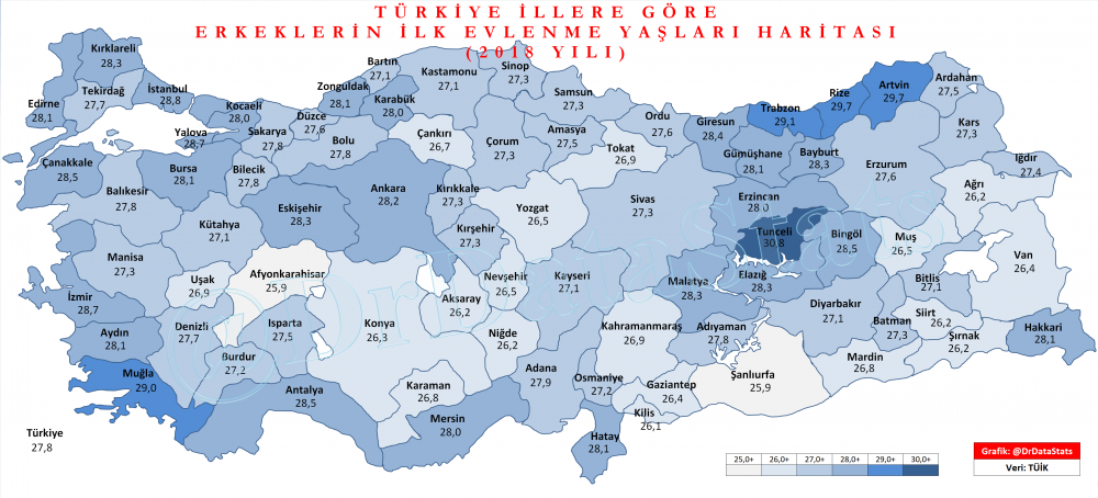 yapılan araştırmalarda illere göre erkeklerde ilk evlilik yaş oranları çıkarıldı.Buna göre en geç evlilik 30.8 ile Tunceli'de gerçekleşirken en erken evlilik ise 25.9 ileŞanlıurfa ve Afyon Karahisar'da yaşanmakta.Ağrı ise 26.2 oranıyla erkeklerde ilk evlilik oranı.