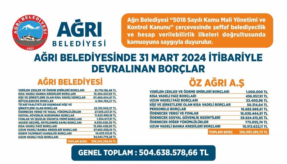 Ağrı Belediyesi tarafından açıklanan borç listesi