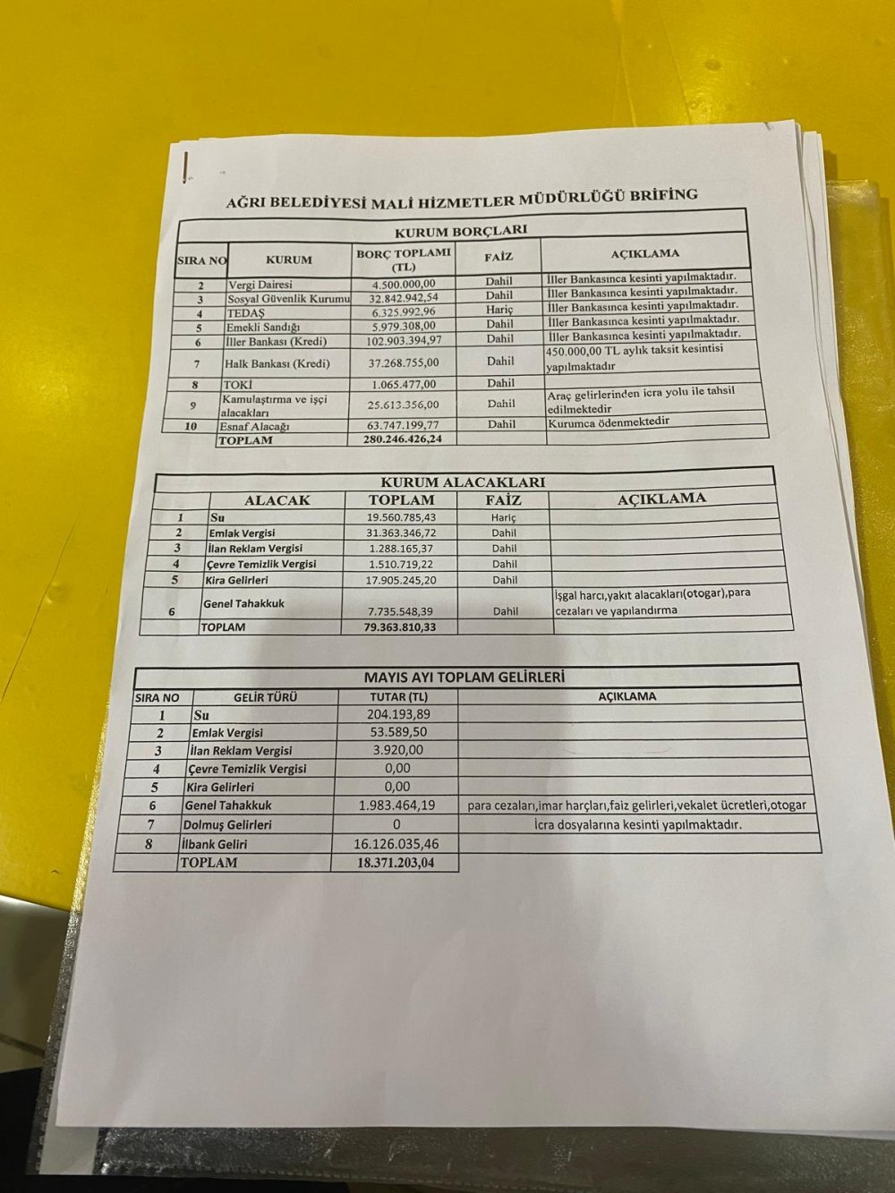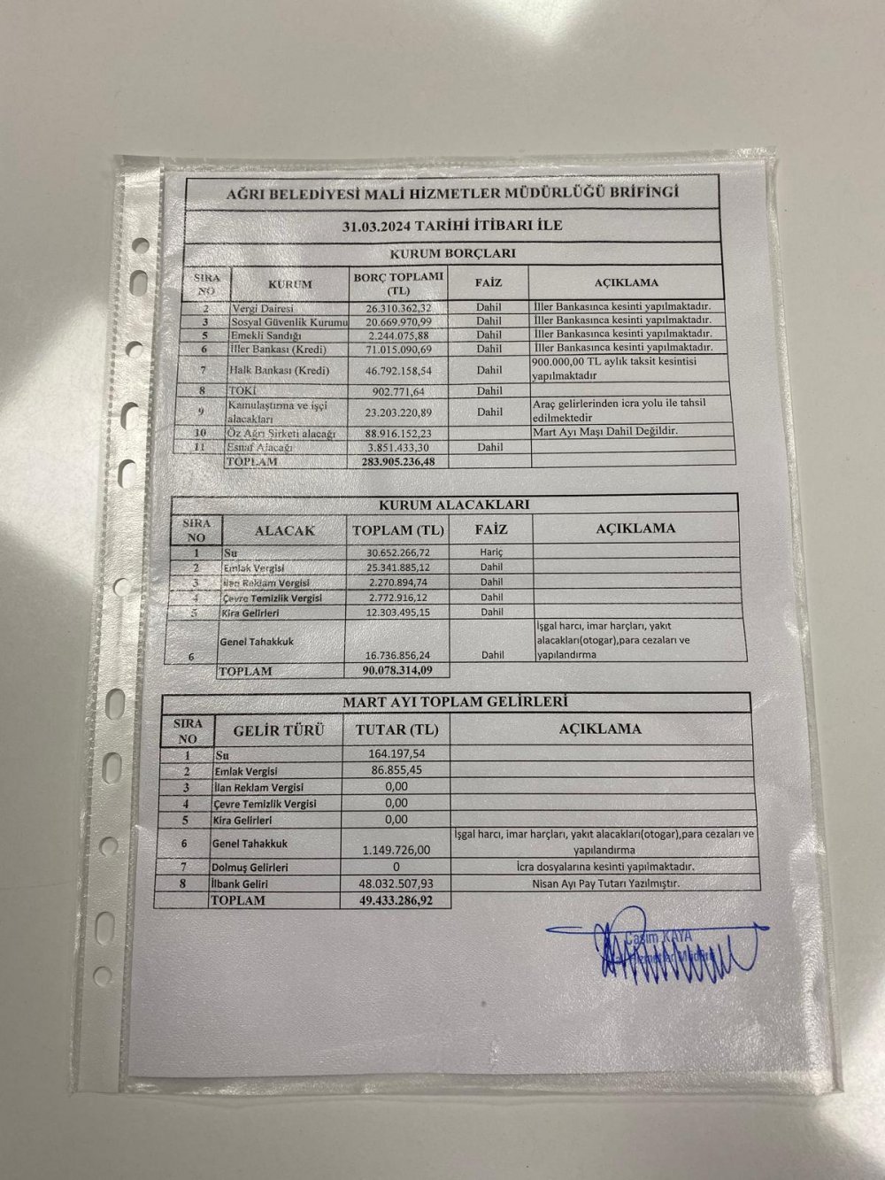 31 Mart Mahalli İdareler seçimleri sonrası el değiştirerek DEM Parti’ye geçen Ağrı Belediyesinin AK Parti dönemine ait muhasebe işlemlerini davet edilen Yeminli Mali Müşavir tarafından incelenmesi yeni bir borç listesi yayınlayarak 3 Nisan tarihinde belediye yi devraldıkları dönemde Belediye Başkanı Metin Karadoğan’ın sunduğu Ağrı Belediyesi Muhasebe Müdürü imzalı borç belgesinin gerçeği yansıtmadığını iddia etti.