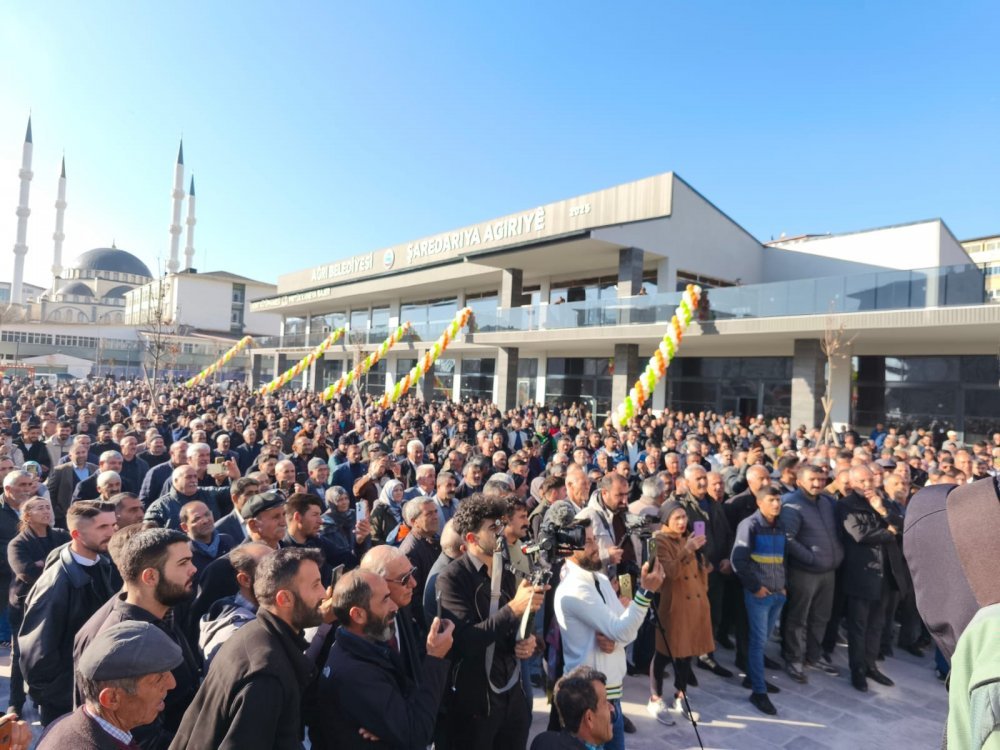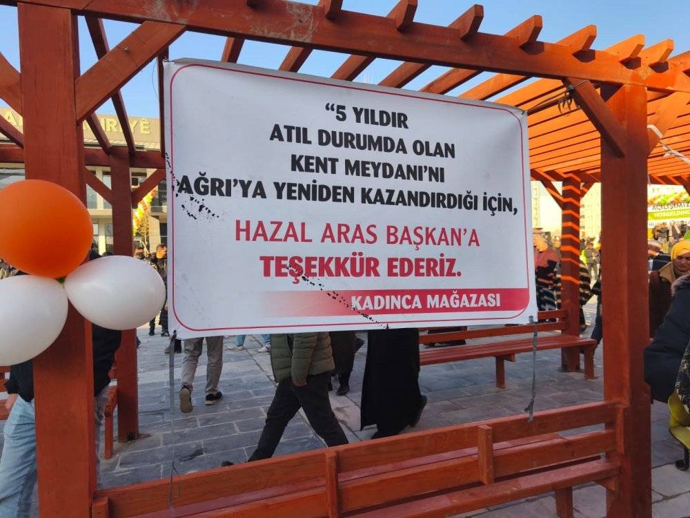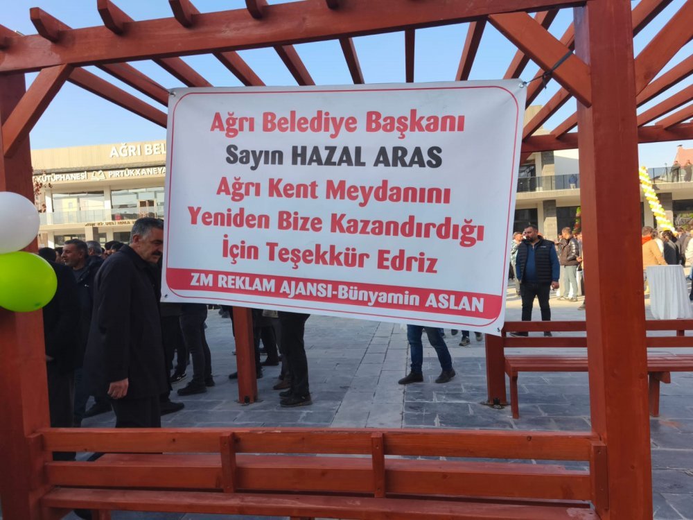 Kayyum Vali Süleyman Elban tarafından Ağrı Belediye Hizmet Binası olarak ihale edilen sonrasında AKP’Lİ Belediye Başkanı SAVCI Sayan döneminde yapımı durdurulan ve sonrasında mahkemelik olan alan 2024 yerel seçim sonuçları ile Belediye Başkanı seçilen Hazal Aras’ın propaganda sürecinde halka sunmuş olduğu proje doğrultusunda kent meydanı olarak bugün hizmete açıldı.