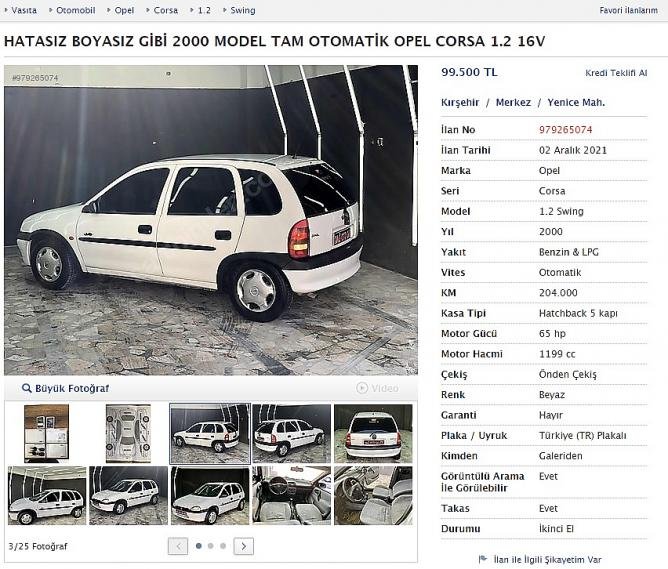 Dolar kurundaki artış ile birlikte Türkiye'deki 2. el oto fiyatları da aldı başını gitti.Öyle ki daha önce 30 bin-40 bin aralığında satılan otomobillerin fiyatları 100 bin TL'yi aştı.Bu durum her ne kadar dolar kuru ile ilişkilendirilse de sıfır araç sektöründeki uluslararası çip krizi de ikinci el otomobillere olan talebi artırdı.Bu duruma Türkiye'deki döviz kurundaki rekor artışlar da eklenince son 10 gün içinde ikinci el otomobillerde ortalama yüzde 20 artış meydana geldi.Öyle ki daha bir kaç yıl önce 30-40 bin aralığında satılan otomobiller 100 bin TL'yi aştı.Mesela Kırşehir'de 2000 model 1.2 16V Opel Corsa aracın fiyatı 99 bin 500 TL'den ilana çıktı.