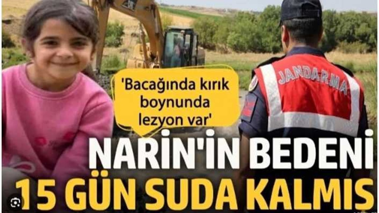 Diyarbakır'da 21 Ağustos'tan bu yana aranan Narin Güran'ın cansız bedene ulaşıldı. Narin'in ön otopsi raporuna göre, boynunda şüpheli bir lezyon ve bir bacağında kırık olduğu belirlendi. Diğer yandan Narin’in yaklaşık 15 gündür su içinde kaldığı belirlendi.