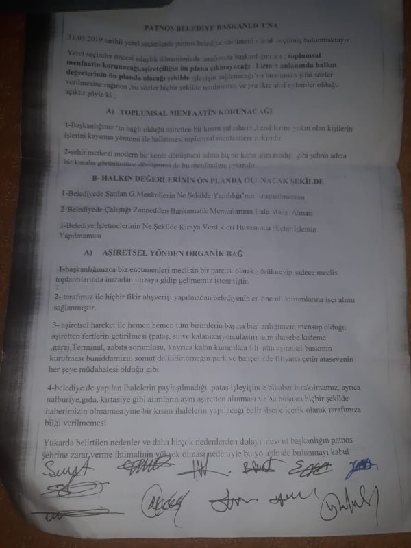 HDP li Patnos Belediye Meclis Üyesi 12 ismin ; ‘’Şakir Sevinç,Birgül Baş,Haydar Demir,Bahattin Özkaya,Atilla Cangir,Nezahat Güler,Yusuf Altunay,Yahya Oyanberdi,Esat Savaş,Kenan Kartal,Salih Taşdemir,Enver Işık ‘’ altına imza attığı belge Patnos Belediyesinin şeffaf ve adil bir hizmet anlayışı içinde olmadığına vurgu yapıyor.