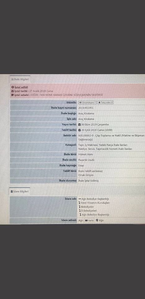 Olağan üstü durumlarda uygulanması gereken davet usulü pazarlık ihale yöntemi ile ihalelerde usulsüzlük yaptığı tespit edilen Ağrı Belediyesi Araç Kiralama işi mahkeme tarafından iptal edildi.