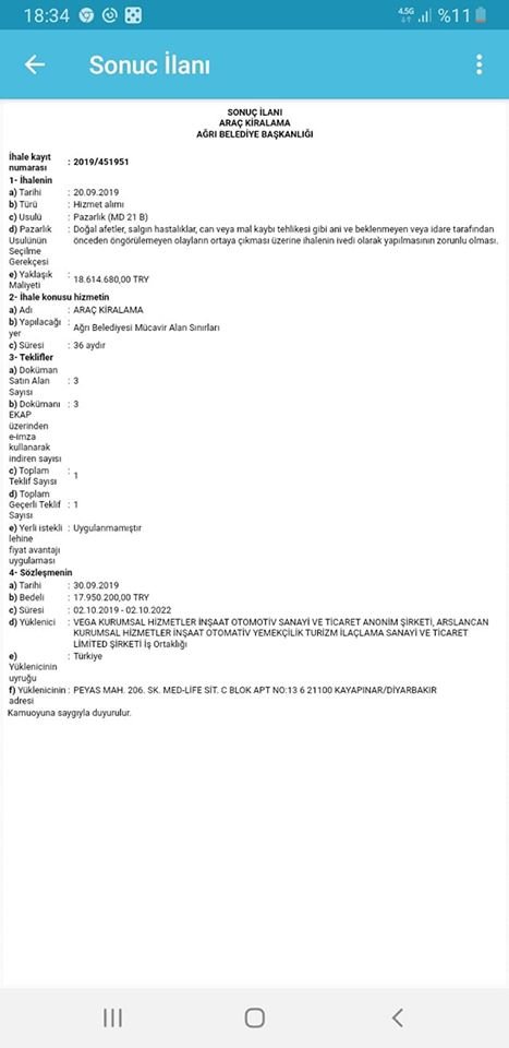 Kamu ihale kanununa muhalefet ederek rekabet ortamını engelleyen ve bu sebeple usulsüz yapılan ihale 17.950.200, Türk Lirası karşılığında tek katılımcı olan ortak girişim dosyasına peşkeş çekilmişti.30 Eylül tarihinde Vega Kurumsal Hizmetler A.Ş ile Arslancan Kurumsal Hizmetler Ltd.Şti ortak girişimi ile Ağrı Belediyesi arasında imzalanan sözleşme 27 Aralık 2019 Cuma günü iptal edildi.