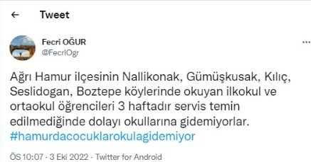 Ağrı’nın Hamur ilçesinde yaşayan Fecri Oğur Twitter hesabından yaptığı paylaşımda ‘’ Ağrı Hamur ilçesinin Nallikonak, Gümüşkusak, Kılıç, Seslidogan, Boztepe köylerinde okuyan ilkokul ve ortaokul öğrencileri 3 haftadır servis temin edilmediğinde dolayı okullarına gidemiyorlar. #hamurdacocuklarokulagidemiyor