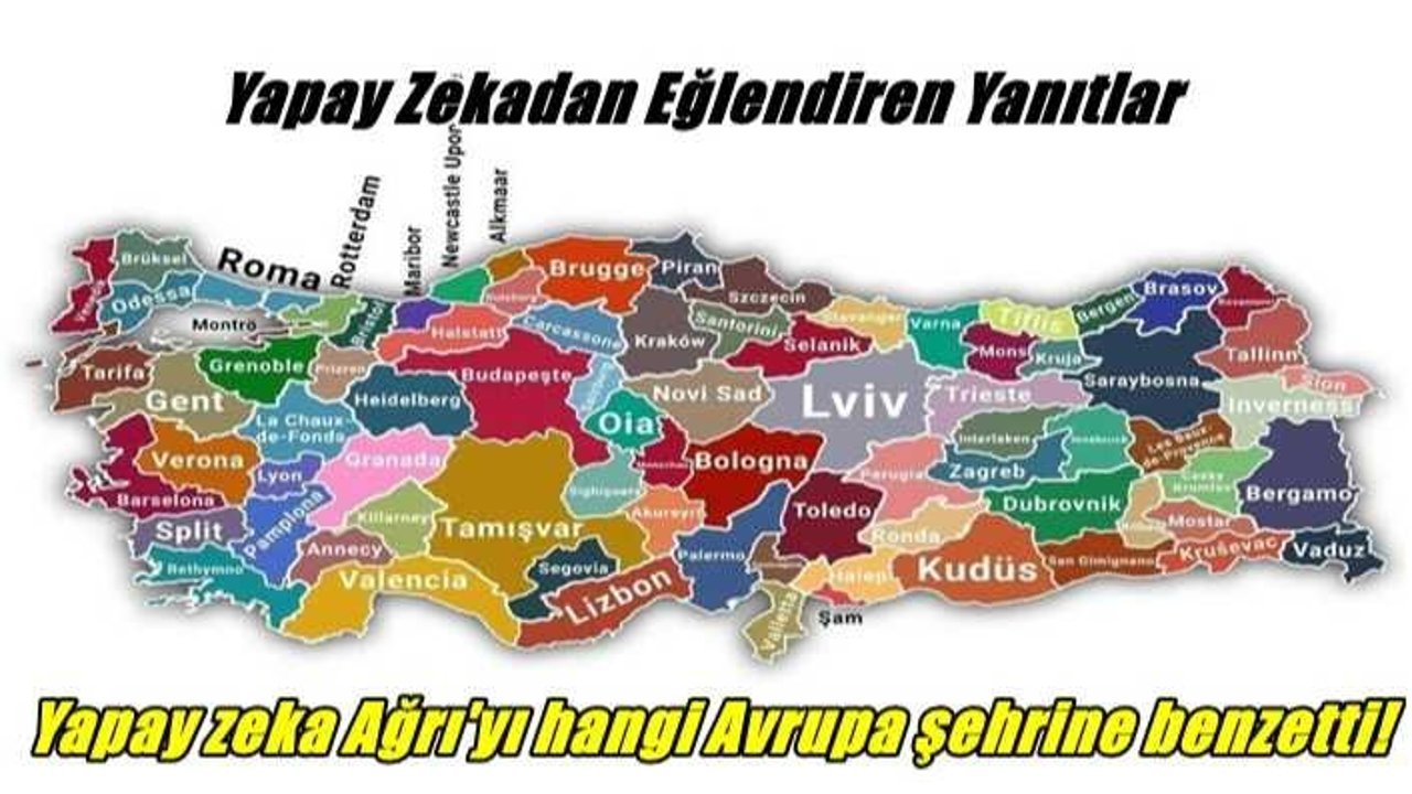 Yapay zeka, Türkiye'deki şehirleri benzerlik açısından dünyadaki diğer şehirlerle karşılaştırdı. Yapılan karşılaştırmada Ağrı İskoçya’nın Inverness kentine benzetirken, İzmir Barcelona, İstanbul Roma, Ankara Budapeşte’ye benzetildi.
